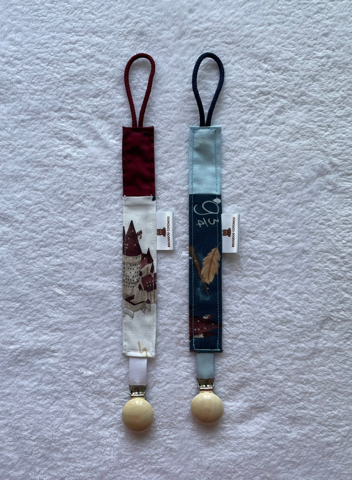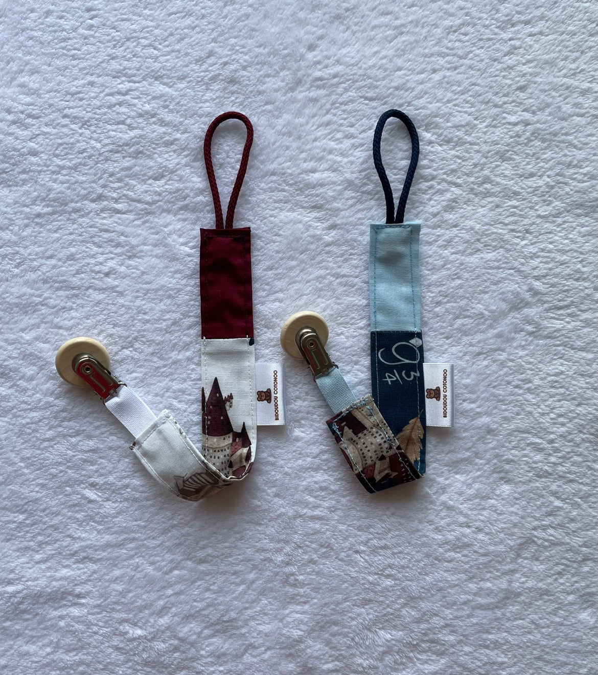 Possibilité de personnaliser l'attache tétine en inscrivant le prénom de votre enfant sur la partie unie. (Inscription en flex, flocage)