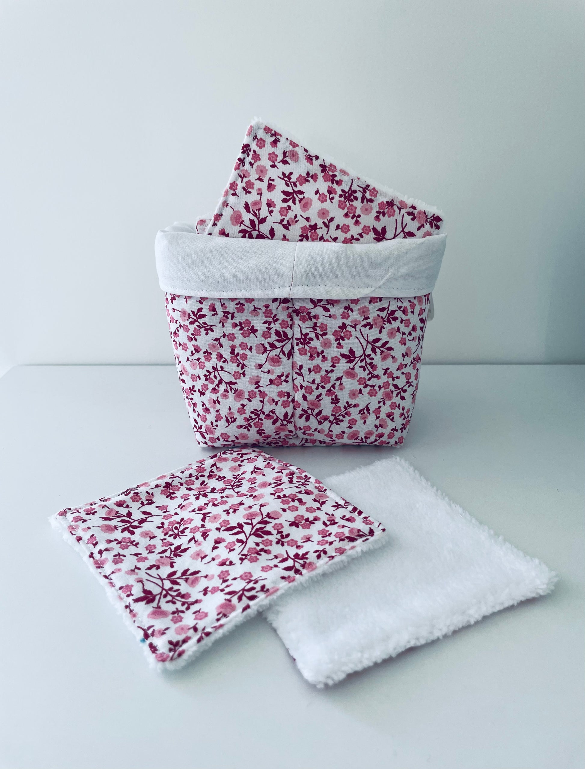 Lot de 8 cotons lavables et réutilisables avec panier assorti pour les ranger dans la salle de bain.
