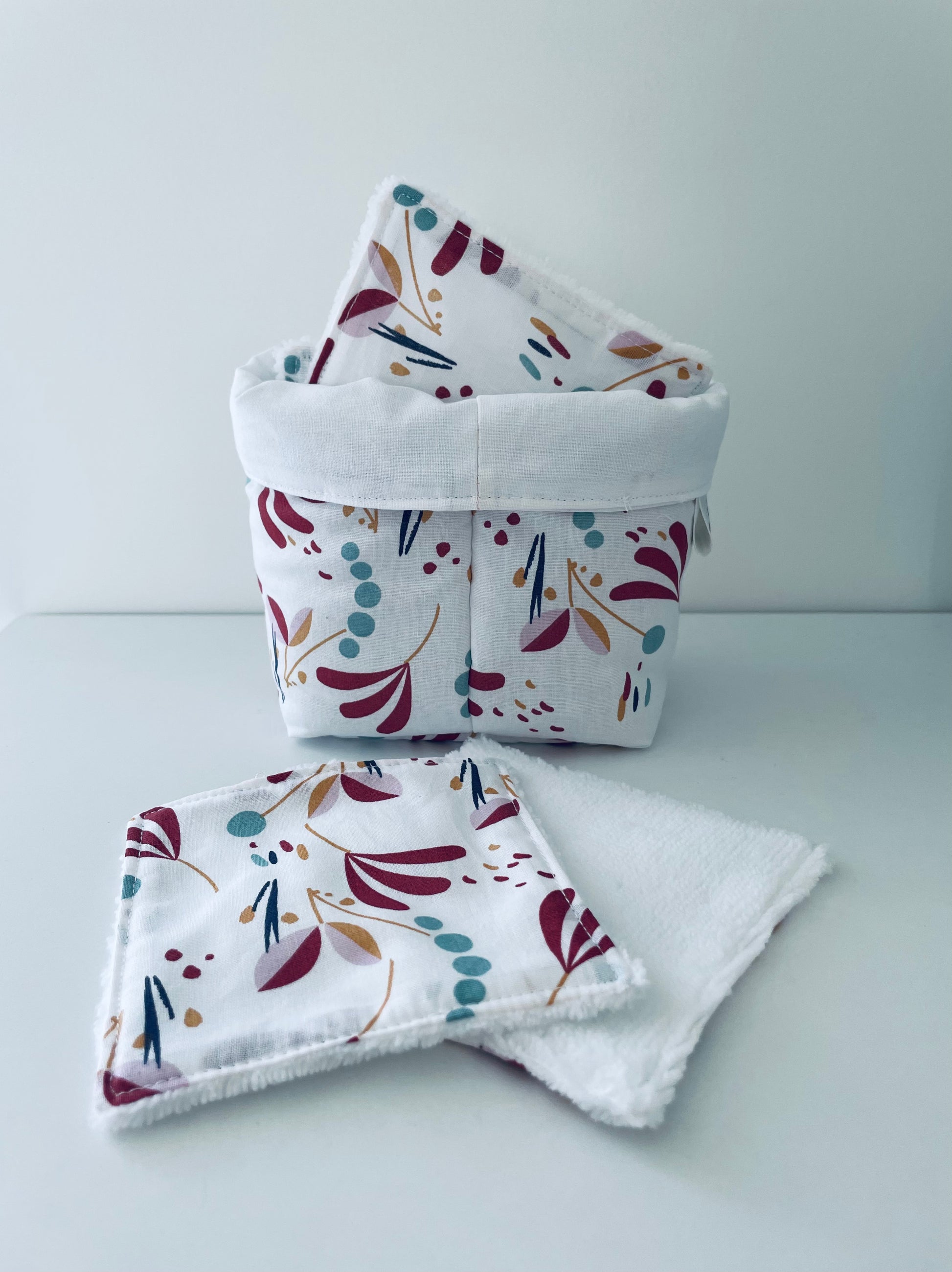 Lot de 8 cotons lavables et réutilisables avec panier assorti pour les ranger dans la salle de bain.