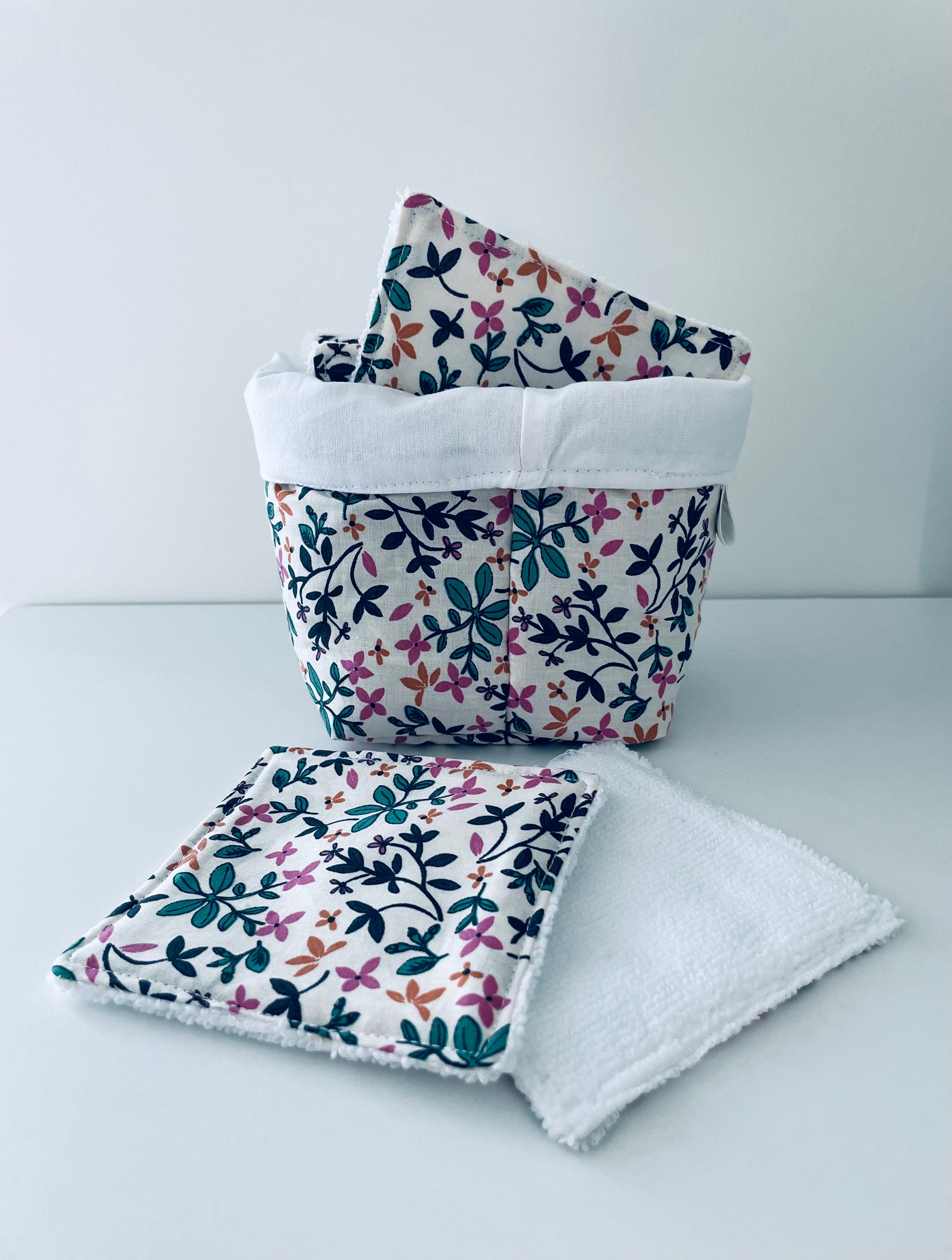 Lot de 8 cotons lavables et réutilisables avec panier assorti pour les ranger dans la salle de bain.