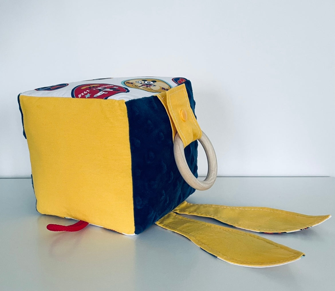 Ce cube est composé de six faces sur trois tissus différents. Plusieurs matières existantes afin de développer le sens du toucher. Les grelots insérés à l’intérieur permettront de developper le sens de l’ouïe, tout comme le papier bruissant inséré dans l’une des deux oreilles.