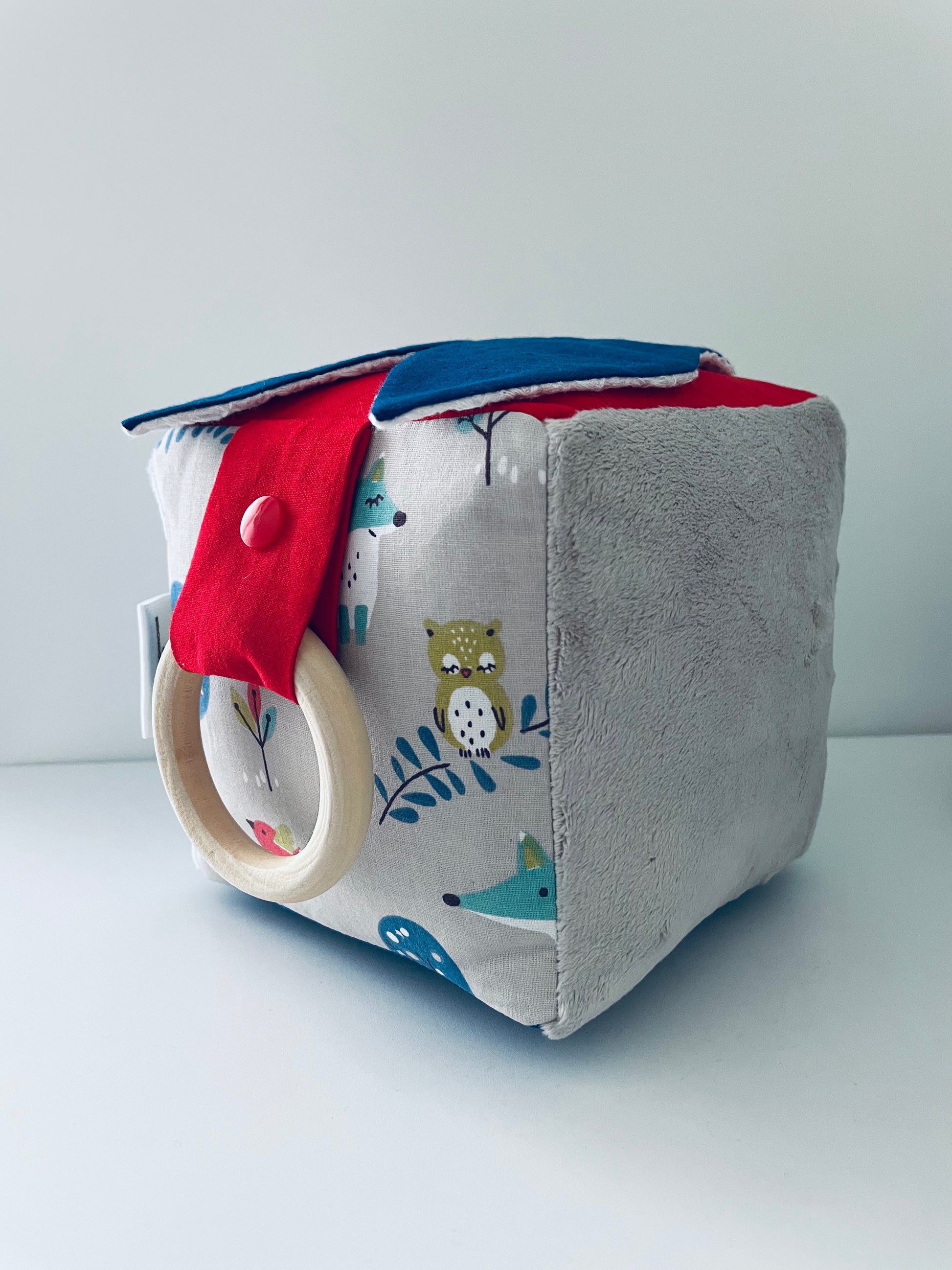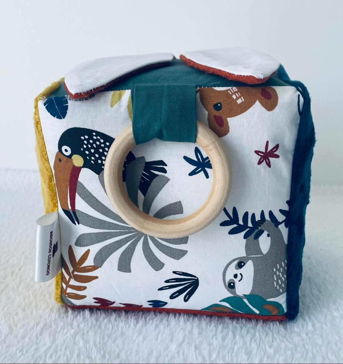 Plusieurs matières sur les différentes faces du cube afin de développer le sens du toucher de votre bébé. Grelots ajoutés à l'intérieur du cube pour developper les sens de l'ouie.