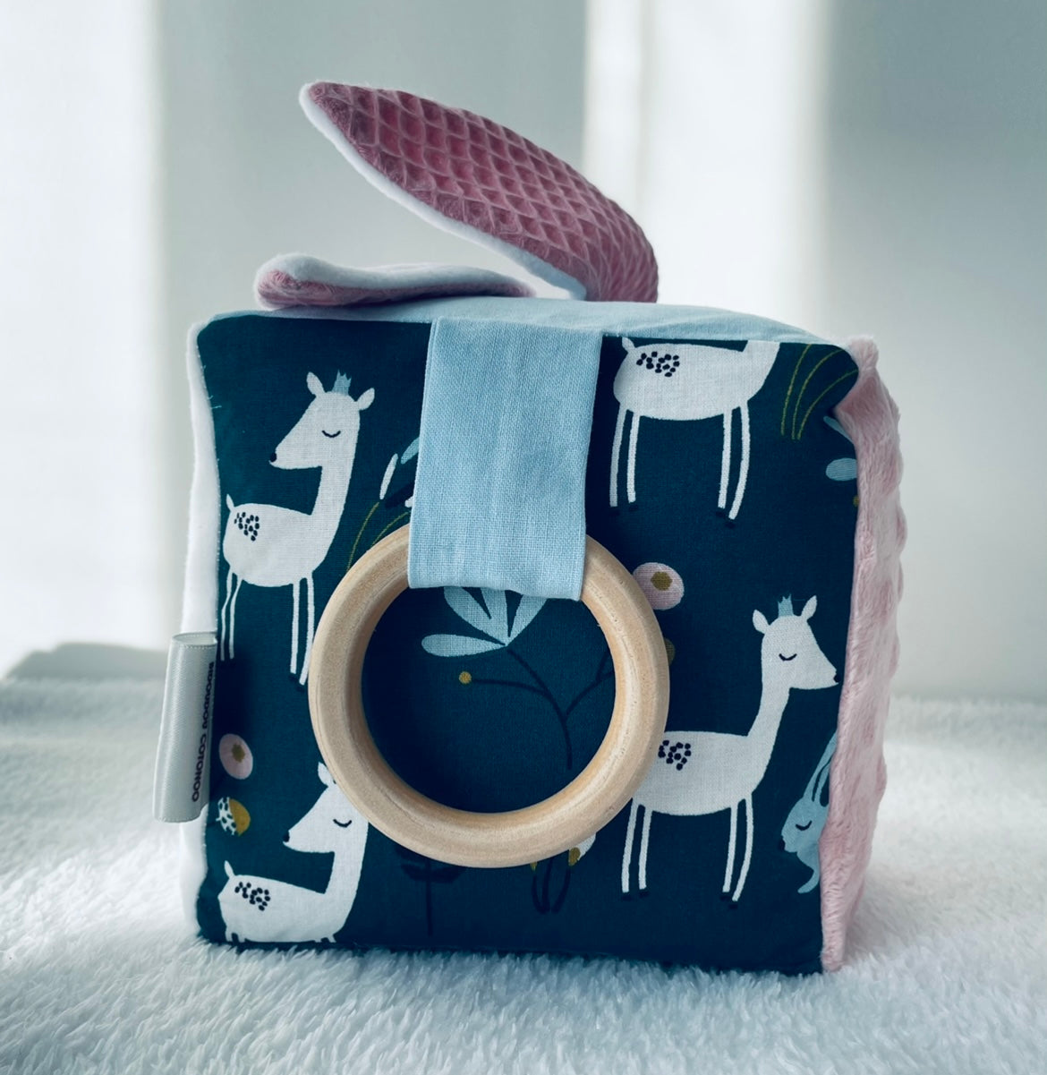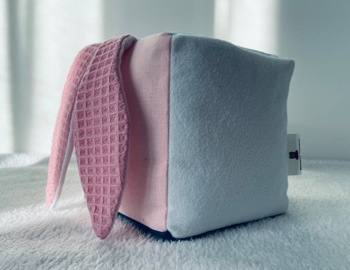 Cube d’éveil oreilles de lapin avec anneau de dentition.